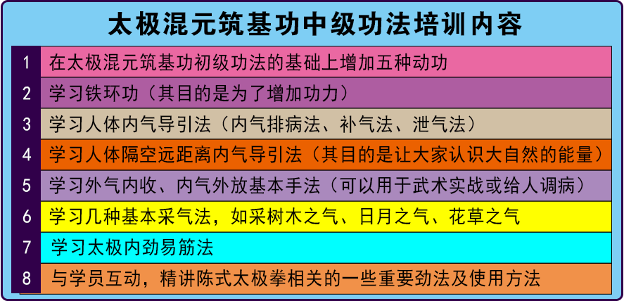 《太极内功修炼法》即常子轩老师独家秘传的《太极混元筑基功》系列部分的核心内容,其功法之神奇,是通过老师亲自面授,一日一桩功,一日一收获,桩桩各不同,得气快,气感强,培固元气,增强人体免疫力,生阳除湿、通经活络,学员通过3天的学习就能体会到内气充盈,遍布全身;【五六天】的强化训练,内气直冲病灶,特别是多年亚健康人群,身体上的疑难病症百分之八十以上有明显的改善。多年来,很多疑难病患者都从这里健康的走出去。而《太极混元筑基功中级功法》通过面授修炼更能感觉到天人合一的神秘力量。太极名家常子轩老师率教练团队,为您尽心服务,全程护航。
